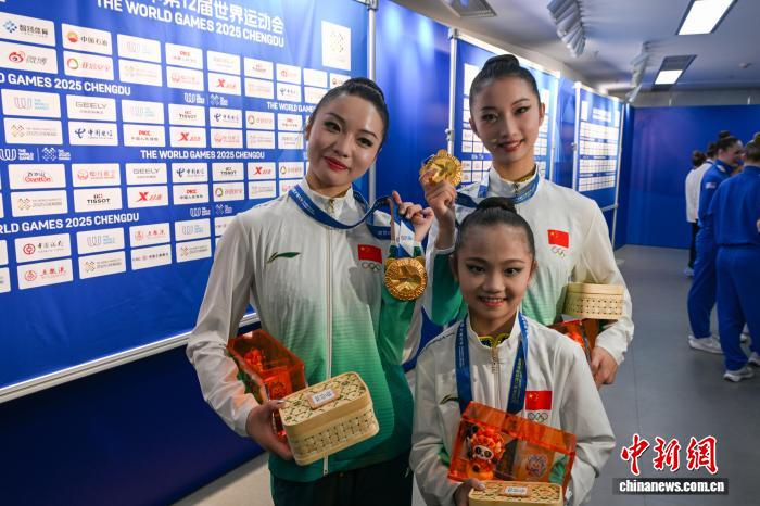 8月9日,中国队选手丁雯妍、顾荃佳、马一星摘得桂冠,三人展示金牌和竹编奖牌盒。 中新社记者 刘忠俊 摄